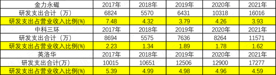 这几年公司研发投入狂砸钱,收入虽然相对金力永磁和中科三环都低,但是研发投入却比两家公司都多,因此研发投入占比也是最多的。