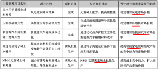 从在研项目也可以看出稀土永磁产品的应用在风电、家电、新能源汽车领域,电机的方向是高性能、低噪音的方向。