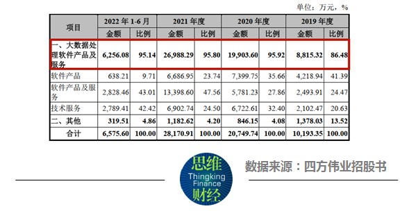 从主营业务收入构成来看,2019年至2022年6月(下称“报告期内”),四方伟业的营收超过9成来自大数据处理软件产品及服务,大数据集成、运营商消息软件产品等其他业务的营收占比不足5%。