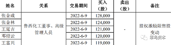 正是在股价高点之际,鲁西化工总计12位董事、高级管理人买入股票,可谓十足的反向操作,这部分属于股权激励限售股的变动。