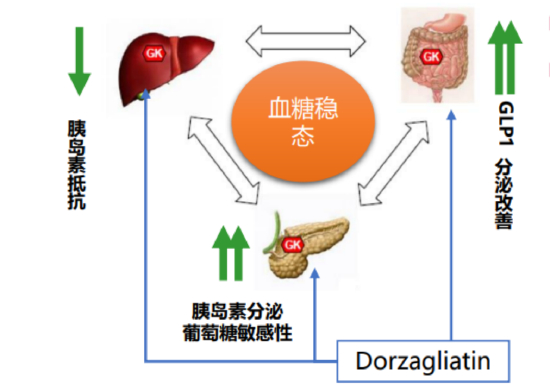 陈力博士表示,GK是血糖调控的“总指挥”,通过修复GK传感器功能,改善2型糖尿病患者的血糖稳态失调。华堂宁®不仅可以作用于胰岛系统,GK还可以在整个血糖稳态调控系统中发挥作用,如在肠道中调节GLP-1的分泌,在肝脏中调节糖的储存和释放。因此,华堂宁®能同时作用于胰腺、肝脏和肠道这三个血糖稳态调控的核心器官,提升了人体整个机体对血糖的敏感性,血糖控制系统工作效率更高,达到改善血糖稳态的功效。