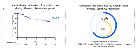 除此之外,在SEED研究基础上,由中华医学会糖尿病学分会常委、南京市第一医院内分泌科主任马建华教授领衔展开了DREAM研究:非药物干预的观察性临床研究。研究显示,总共69个受试对象,接受多格列艾汀治疗血糖达标后,52周停药缓解率达到65.2%。