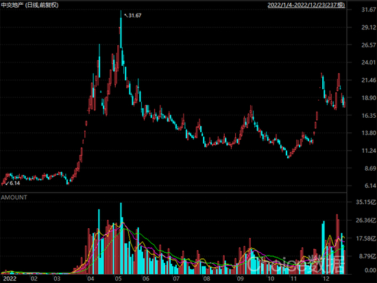 在3月份的地产行情中,中交地产从3月23日起算的17个交易日内,共收获12个涨停,区间最高涨幅达182%;在11月份的地产行情中,中交地产从11月24日起收获一轮6连板,区间涨幅为77%。