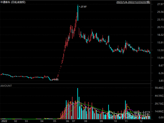 中通客车是那轮新能源汽车行情的领涨龙头,公司股价从5月13日起步,到7月19日见顶,先后经历两次停牌核查,32个交易日共收获17个涨停,包括一轮疯狂的13连板,区间最高涨幅达到433%。