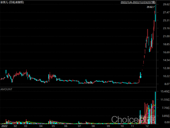 随着11月疫情形势发生变化,安奈儿的“抗病毒面料”技术被推至风口浪尖,公司股价从11月18日起算的26个交易日内,共收获14个涨停,其中包括一波7连板,区间最大涨幅达到202%。