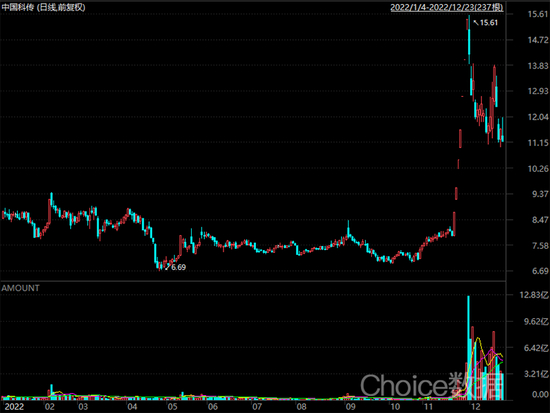 在本轮“中字头”行情中,中国科学院控股有限公司旗下的中国科传涨势突出,公司股价从11月22日开始走出一波7连板,累计涨幅达95%。但随后,“中字头”板块迅速熄火,中国科传股价也快速回撤,12月以来已较高点回撤近30%。