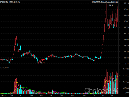 作为A股供销社板块龙头,实际控制人为山东省供销合作社联合社的天鹅股份,股价从10月31日开始,一口气收出连续11个涨停,区间涨幅达到185%。此后,公司股价转入高位宽幅震荡,目前最新价较当初高点相差无几。