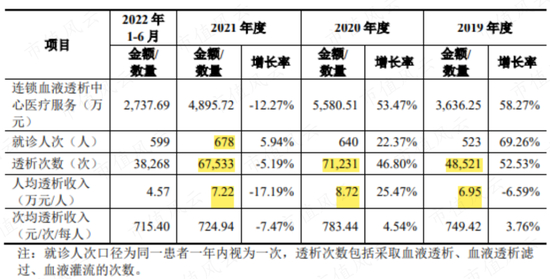 2021年,公司旗下连锁血液透析中心医疗服务营收大约5000万元,就诊人次总计678人,透析次数6.7万次,大约每位病人每年治疗100次,人均透析收入达到7.2万元,即单次720元。