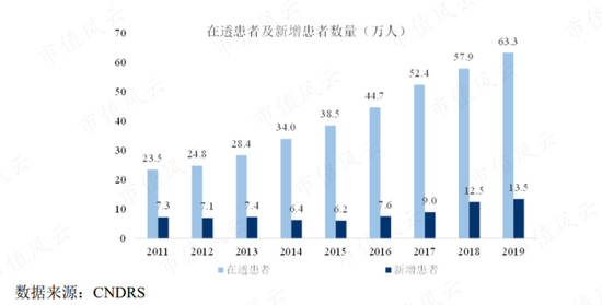 据全国血液净化病例信息登记系统(CNRDS)统计:2016年接受血液透析治疗的患者人数为44.7万人,2019年底已达到63.3万人,年均复合增长率达12%。