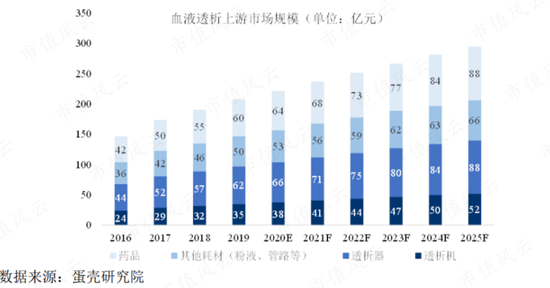 更具体的,根据蛋壳研究院的测算,2020年,透析机、透析器、其他耗材(粉液、管路等)及药品的市场规模分别在38亿元、66亿元、53亿元及64亿元左右。