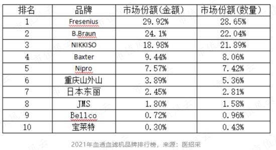 而设备方面,根据蛋壳研究院统计的数据,2020年国内血液透析机销量中,费森尤斯30%的市场份额位居榜首,费森尤斯、贝朗、日机装、百特以及尼普洛5大外资厂商占据了国内血液透析市场80%-90%左右的市场份额。