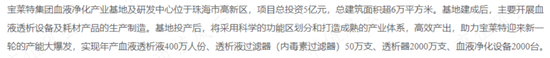 2022年7月,宝莱特集团血液净化产业基地及研发中心主体工程正式封顶,项目将于2023年建成投产使用,投资额5亿元,建成后将实现年产透析器2000万支,设备2000台,血液透析液400万人份,透析液过滤器50万支。