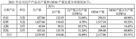 数据显示,2021年浪莎股份所有产品生产量共计2535.92万,其中自产量418.06万,占比16.49%;贴牌产量2117.86万,占比83.51%。