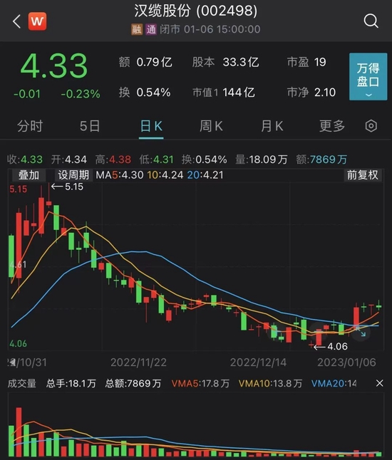 1月6日,汉缆股份收报4.33元/股,收盘跌幅为0.23%,总市值为144亿元。