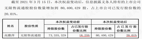 2021年3月15日,公司披露详式权益变动报告书,高雅萍通过集合竞价交易增持公司1.76%的股份,其持股比例从18.25%增至20.01%。按照当日收盘价8.65元计算,耗资约为0.6亿元。