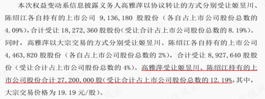 此次转让完成后,蒯一希及其配偶合计持股比例由21.18%下降为16.08%,高雅萍持股比例由20.01%上升到25.11%。