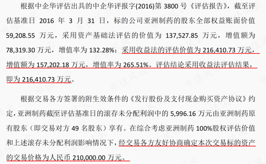 2016年3月31日,亚洲制药按收益法估值为21.6亿元,溢价率266%,协商后交易价格为21亿元:以现金支付对价8.7亿元,发行股份支付对价12.3亿元。