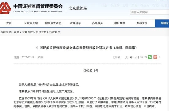 上述2名违法人员,其中1名是时任海科融通第一大股东——北京海淀科技董事,同时担任海淀科技控股股东——北京市海淀区国有资产投资经营有限公司经营管理部负责人的杨刚。另一名人员是其配偶陈攀攀。