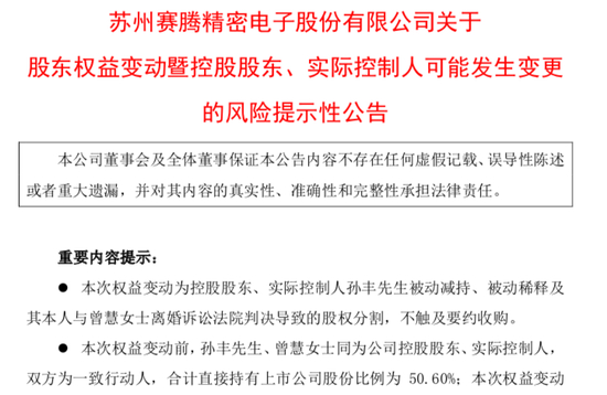1月10日,赛腾股份(603283.SH)公告称,因控股股东、实际控制人孙丰、曾慧二人离婚,孙丰名下的3776.24万股股权拟变更至曾慧名下。