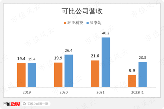 公司与贝泰妮的营收规模在2019年基本相当,均为19.4亿元。