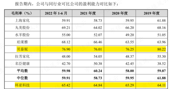 得益于DTC渠道省去了“中间商赚差价”,贝泰妮的毛利率一直领先于业内同行。