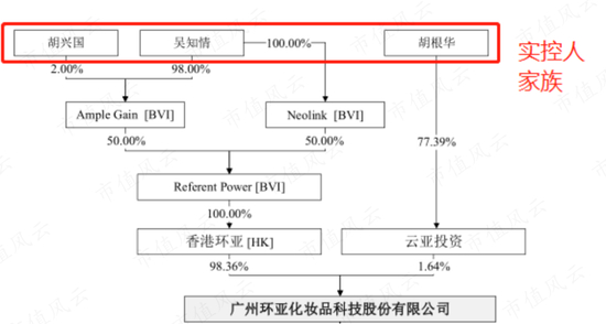 环亚科技的控股股东为持股98.36%的香港环亚,实控人为胡兴国、吴知情和胡根华三人。