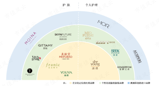 公司的品牌组合庞大,目前合计15个品牌,除上述知名度较高的三个外,还包括“肌肤未来”“御芝丹青”“即肽”“澳魅”“妙芙谜”“康柏雅”等,覆盖防晒、面膜、乳液、洗发水、精油、香氛等细分领域。