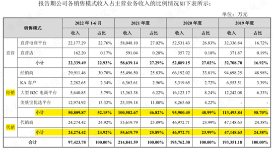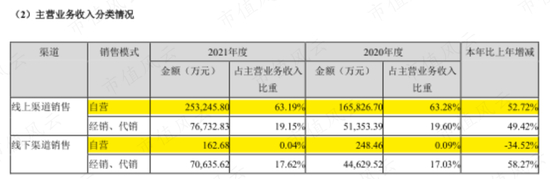 相比之下,贝泰妮的销售渠道更单一,以线上自营为主。2021年,线上自营渠道贡献了贝泰妮63%的营收。
