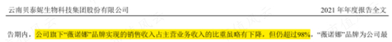 较为例外的是近年来风头正盛的本土企业贝泰妮,其一直主打核心品牌“薇诺娜”。据贝泰妮披露,2021年,单一品牌“薇诺娜”的营收贡献超过98%。