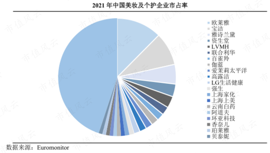 根据Euromonitor数据,按零售额口径计,2021年公司和贝泰妮的市占率相当,均为1%,行业排名第16名。