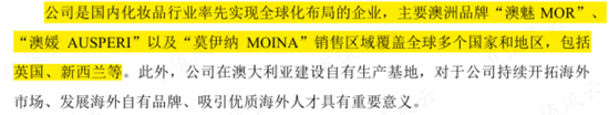 “全球化”主要是指公司拥有三个澳洲子品牌:“澳魅(MOR)”“莫伊纳(MOINA)”和“澳媛(AUSPERI)”,据披露其销往英国、新西兰等地。