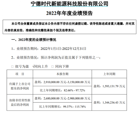 不过,行业特例出现在“宁王”身上。宁德时代12日披露的业绩预告显示,其2022年归母净利润预计为291亿元-315亿元,同比增长82.66%-97.72%;而扣非归母净利润为268亿元-290亿元,同比增长99.37%-115.74%。宁德时代表示,业绩上升的原因主要是产销量提升及降本增效作用。