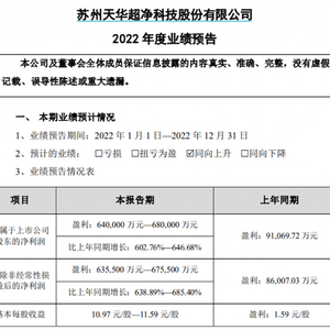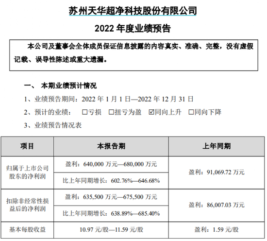 在天华超净方面,该公司预计2022年归母净利润64亿元至68亿元,同比增长602.76%-646.68%,扣非净利润63.55亿元至67.55亿元,同比增长638.89%-685.40%。这一业绩增长幅度,在目前已披露业绩预告的224家公司中也位居前列。