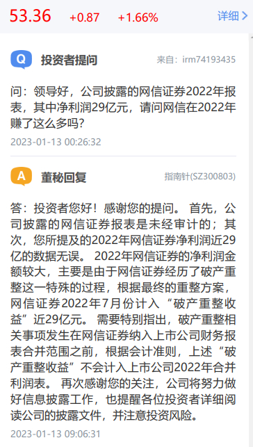今日(2023年1月13日)盘前,指南针副总经理兼董秘孙鸣对此回应称,主要是由于网信证券经历了破产重整这一特殊的过程,根据最终的重整方案,网信证券2022年7月份计入“破产重整收益”近29亿元。