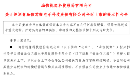 海信视像提到,本次筹划控股子公司分拆上市,有利于拓宽青岛信芯微的融资渠道,提升公司和青岛信芯微的核心竞争力。“但分拆上市事项尚处于前期筹划阶段,实施过程中仍然会存在各种不确定因素,需满足多项条件方可实施。”