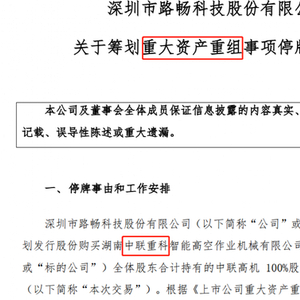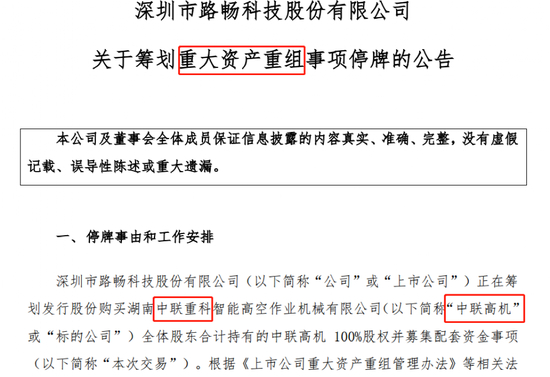 1月16日,中联重科公告,拟分拆所属子公司中联高机,通过与路畅科技进行重组的方式实现在深交所上市。路畅科技则公告,将通过发行股份方式收购中联高机100%股权,同时发行股份募集配套资金,交易构成路畅科技重大资产重组。