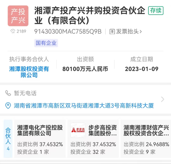 资料显示,湘潭产投投资成立于今年1月9日,其主要出资方湘潭电化产投控股集团有限公司,由湘潭市国资委全资所有。