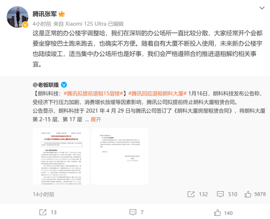 而腾讯则对“中新经纬”表示,退租属于办公楼宇的正常调整。随着自有大厦的投入使用、以及未来新办公楼宇的陆续竣工,腾讯针对个别零散的租赁物业进行了调整优化。