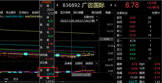 今年1月12日,广咨国际全天成交额仅2212元
