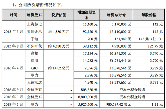 而根据《招股说明书》,金米投资在2015年3月出资1314万元成为石头科技股东,顺为则在2016年4月、2019年3月两次增资,分别投入1089.85万元、980.59万美元(按当时汇率,约6570万元人民币)