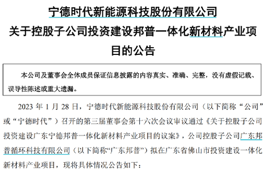 宁德时代公告显示,拟由控股子公司广东邦普循环科技有限公司(简称:邦普循环)在广东佛山投资建设一体化新材料产业项目,投资总金额不超过238亿元。