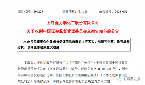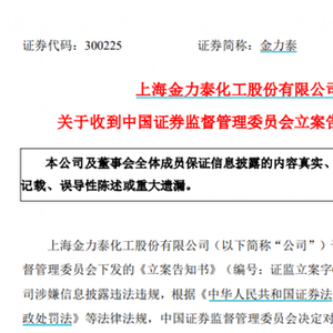 2月3日晚间,金力泰发布公告,称公司于近日收到中国证券监督管理委员会下发的《立案告知书》,因公司涉嫌信息披露违法违规,根据《中华人民共和国证券法》《中华人民共和国行政处罚法》等法律法规,中国证券监督管理委员会决定对公司立案。