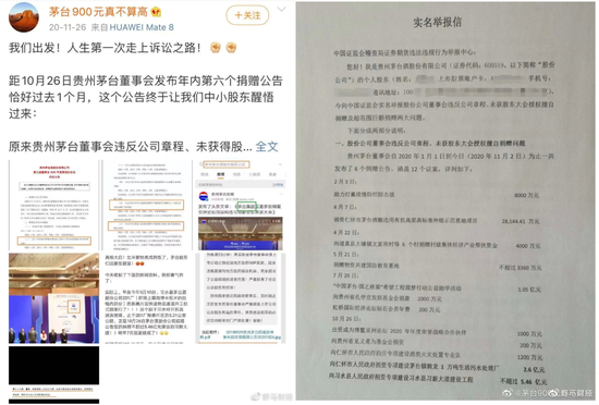 首先是2020年10月,茅台宣布要对习水县人民政府、仁怀市人民政府和贵州省见义勇为基金会无偿捐赠合计8.2亿元,用于建设生活污水处理厂、习新大道等项目。此举一度遭到了200多名中小股东的集体投诉和实名举报,被质疑“慷他人之慨、侵犯股东权益”。