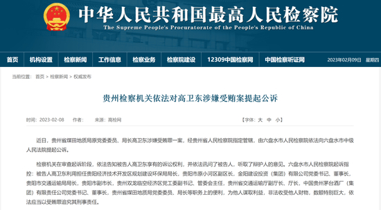 2月8日,最高人民检察院发布的消息称,高卫东涉嫌受贿罪一案,已由六盘水市人民检察院依法向六盘水市中级人民法院提起公诉。就在十天前,贵州省纪委监委反复专题片《一严到底——贵州正风肃纪反腐》中,刚刚披露了高卫东的贪腐细节。