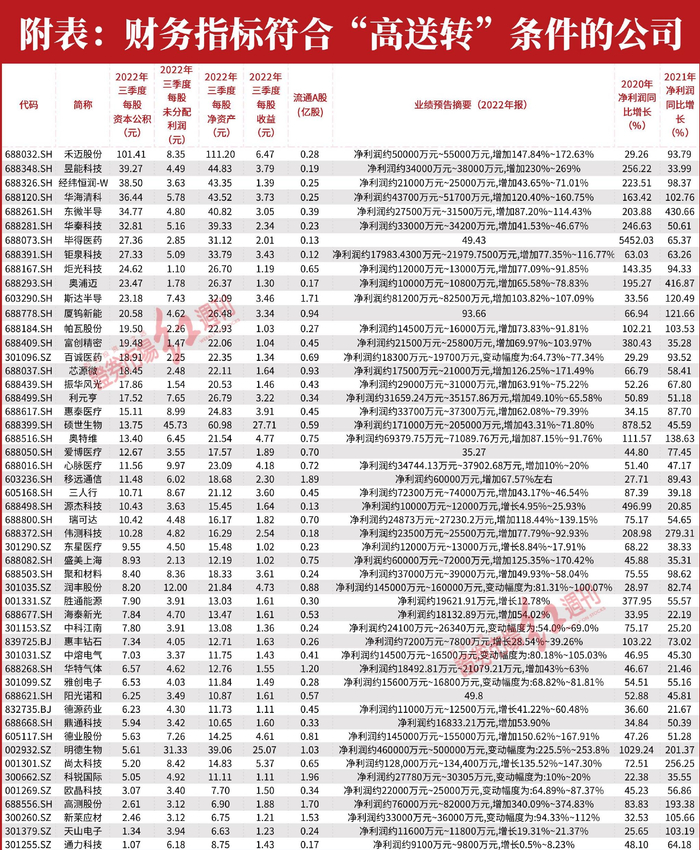 以此条件结合上市公司2022年三季度的财务指标与目前提前发布的2022年业绩预告和业绩快报的净利润成长性整理统计,已有禾迈股份、昱能科技、经纬恒润—W、华海清科、东微半导等51家公司达到了“高送转”的条件,其中包括了多家细分行业的龙头企业(见附表)。