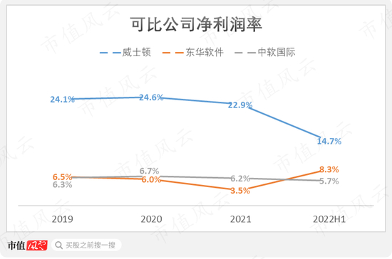 2021年,公司、东华软件和中软国际的净利润率分别为22.9%、3.5%和6.2%。