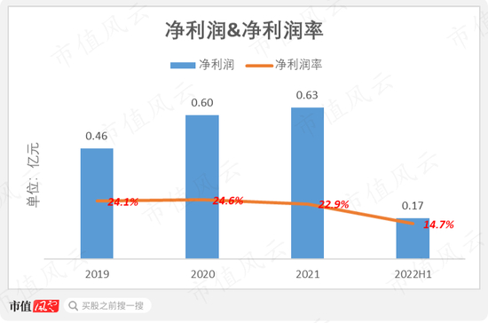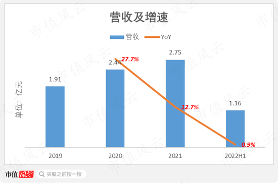 2021年营收2.8亿元,同比增12.7%;2022年上半年营收1.2亿元,同比仅增0.9%。