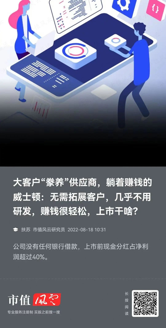 关于公司基本面的更多分析,感兴趣的老铁可以查阅风云君此前研报《大客户“豢养”供应商,躺着赚钱的威士顿:无需拓展客户,几乎不用研发,赚钱很轻松,上市干啥?》。