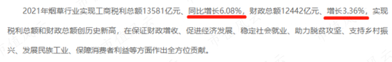 据中烟官网披露,2021年,国内烟草行业按实现工商税利总额和财政总额,分别同比增6.1%和3.4%。