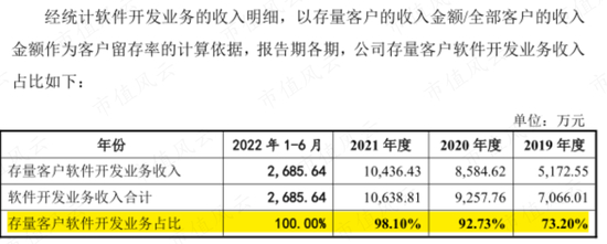 2019年,公司的存量软件开发客户留存率仅为73.2%,此后逐年上升。2022年上半年,客户留存率高达100%。